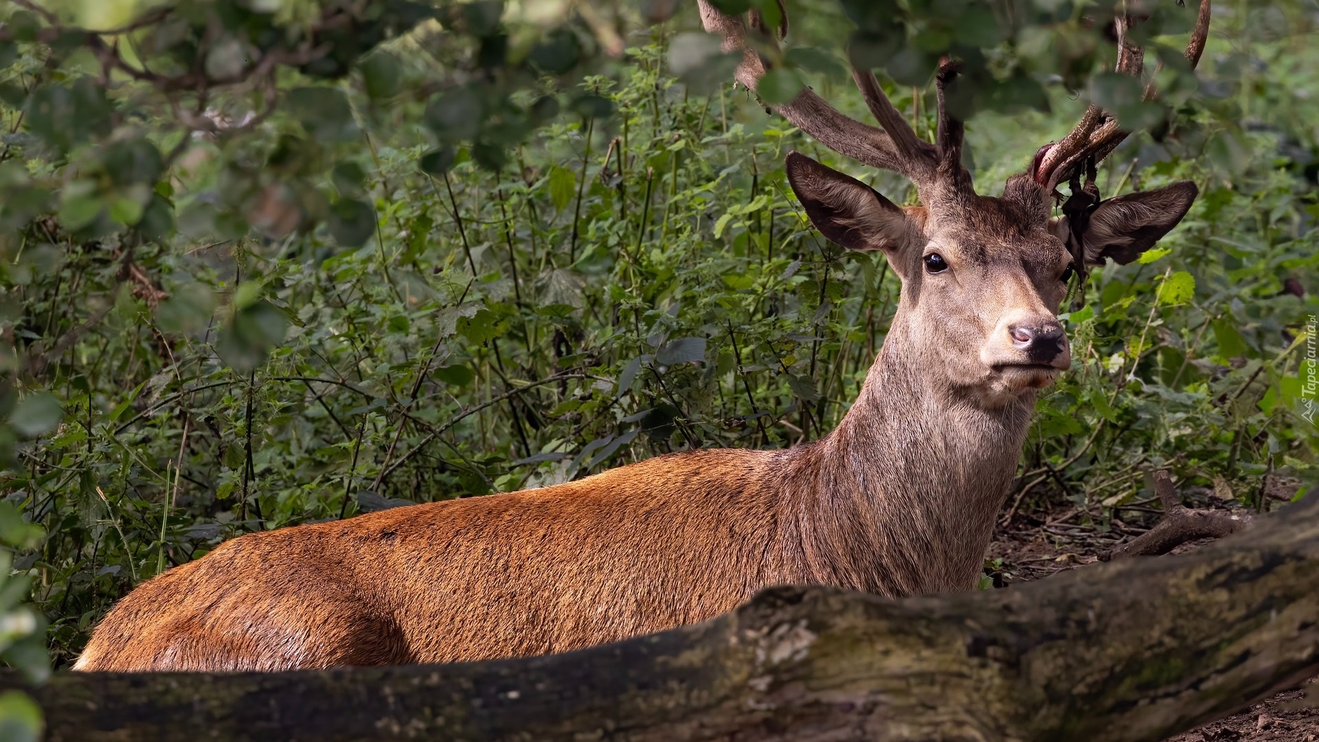 Edytor tapety: Jeleń za kłodą drzewa