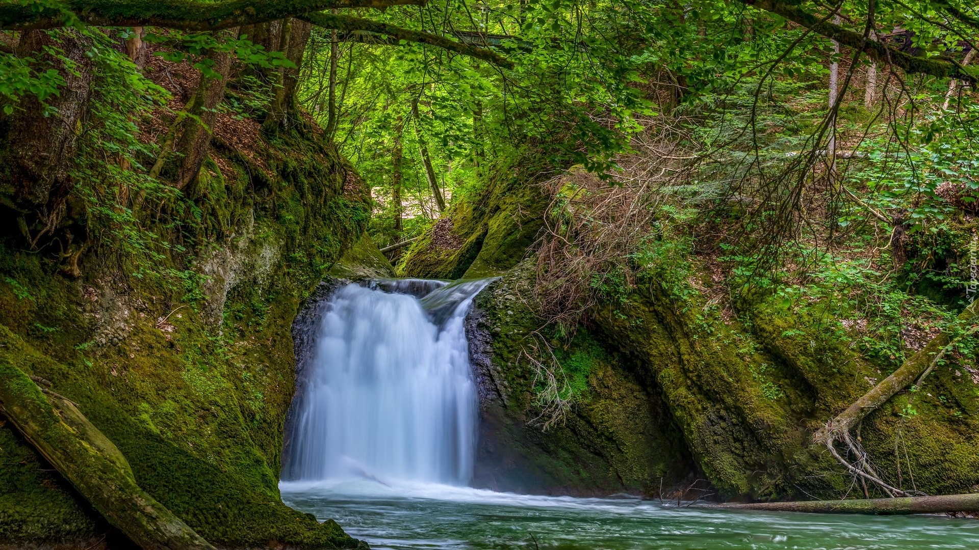 Edytor tapety: Drzewa na omszałych skałach przy wodospadzie