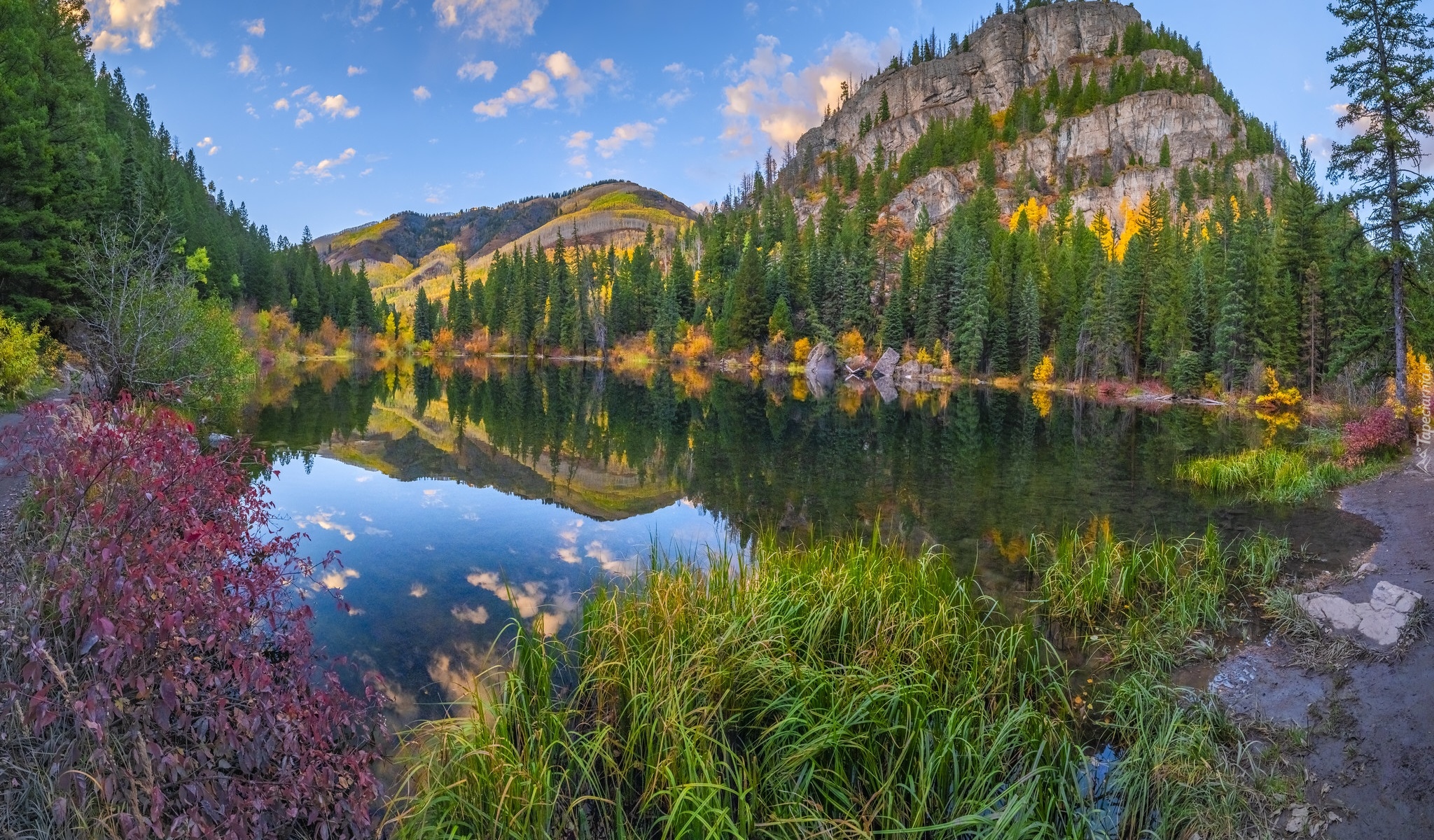 Edytor tapety: Odbicie w jeziorze gór i jesiennych drzew