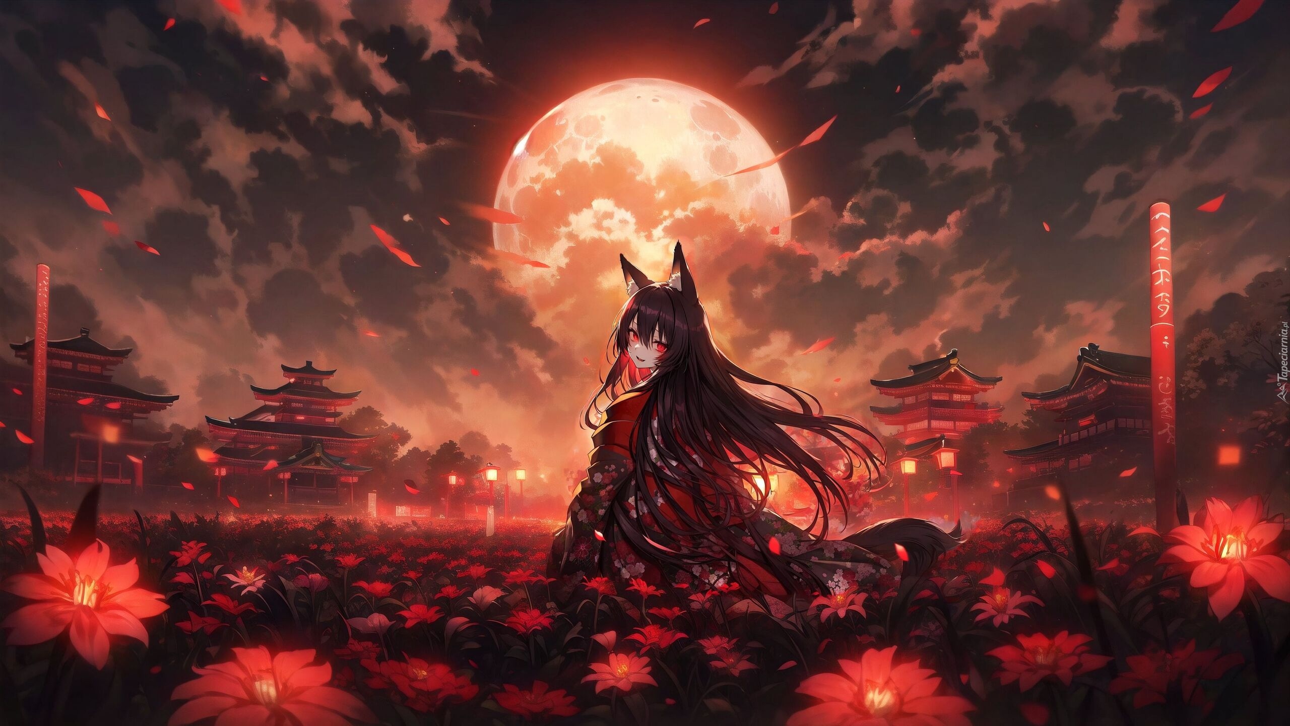 Edytor tapety: Neko wśród kwiatów na tle księżyca w anime