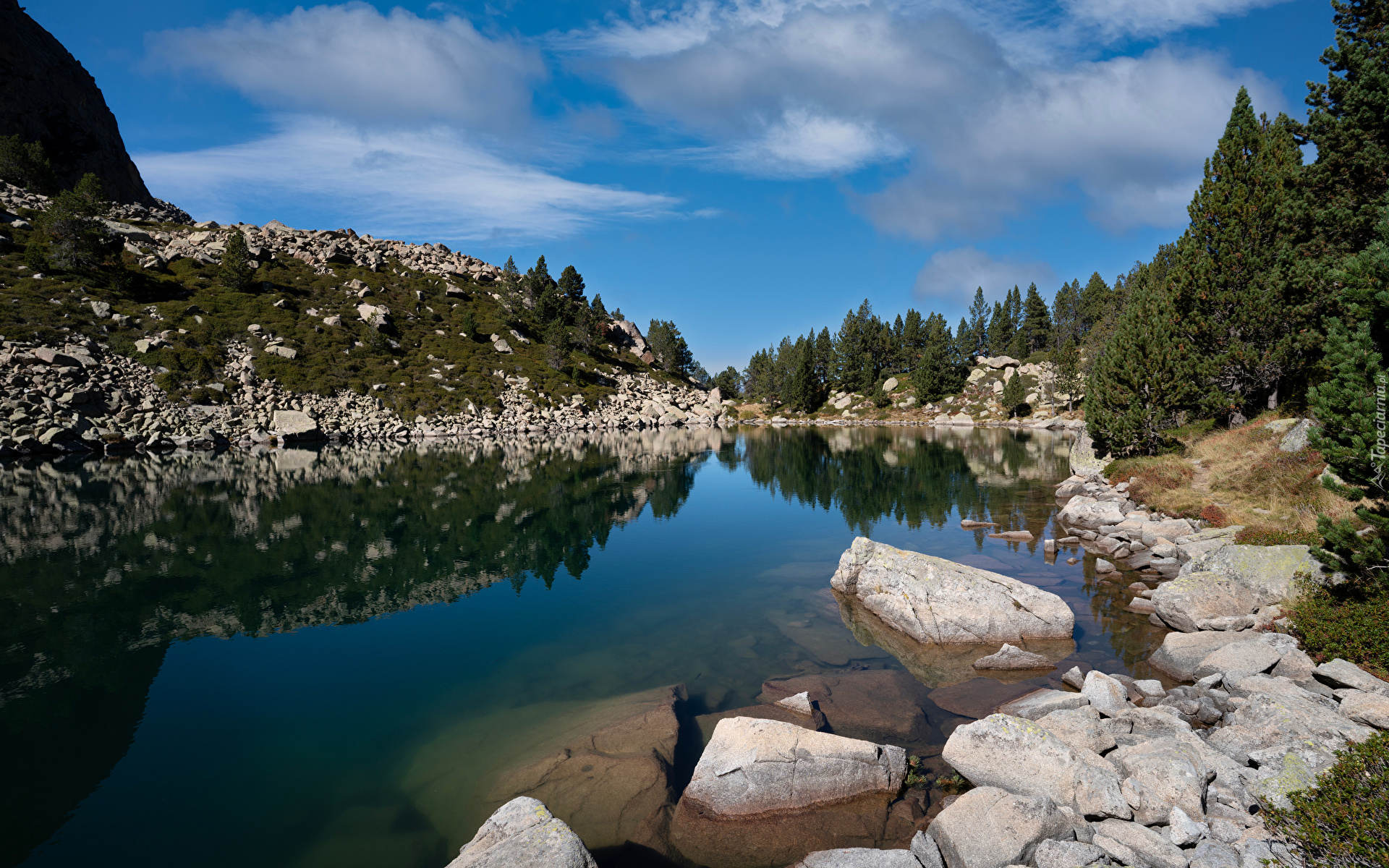 Edytor tapety: Duże kamienie i drzewa przy brzegu jeziora