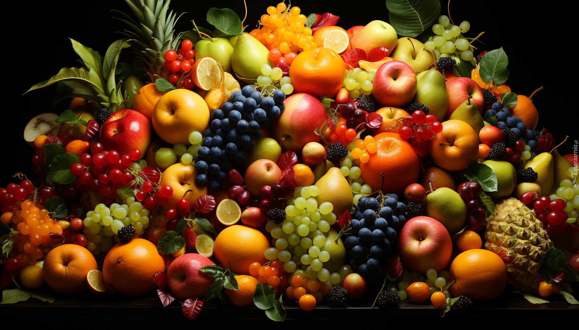 Edytor tapety: Rozświetlone różne owoce na czarnym tle
