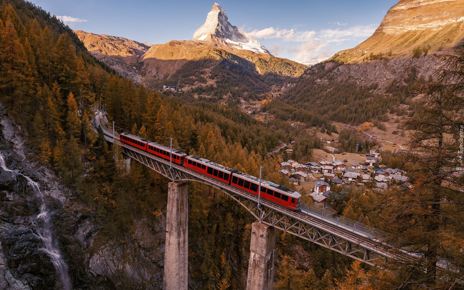 Edytor tapety: Pociąg na wiadukcie kolejowym w alpejskim miasteczku Zermatt