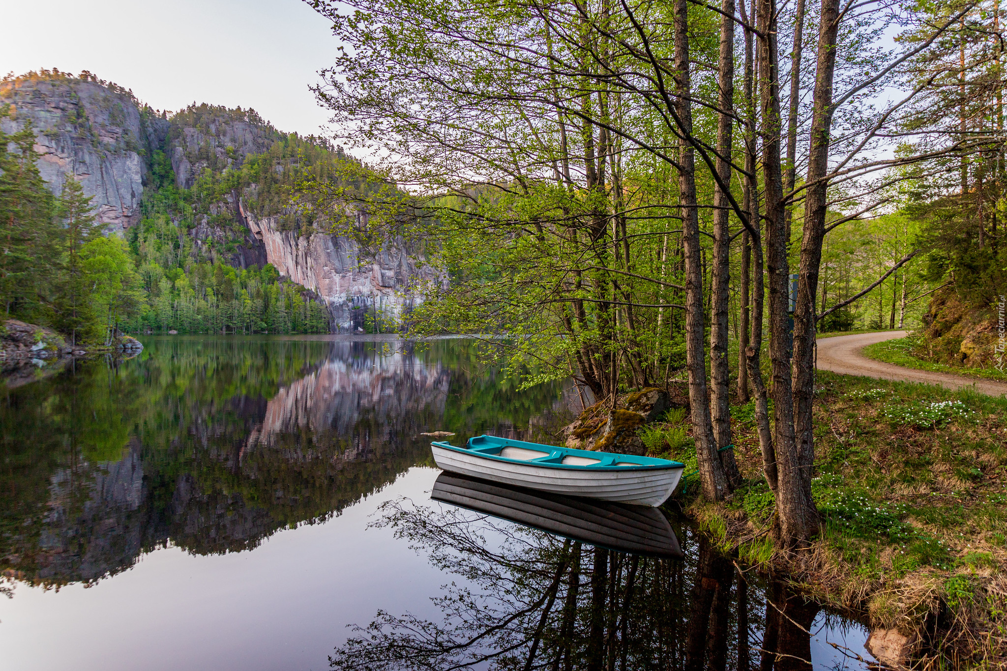 Edytor tapety: Łódka na brzegu jeziora i w oddali góry