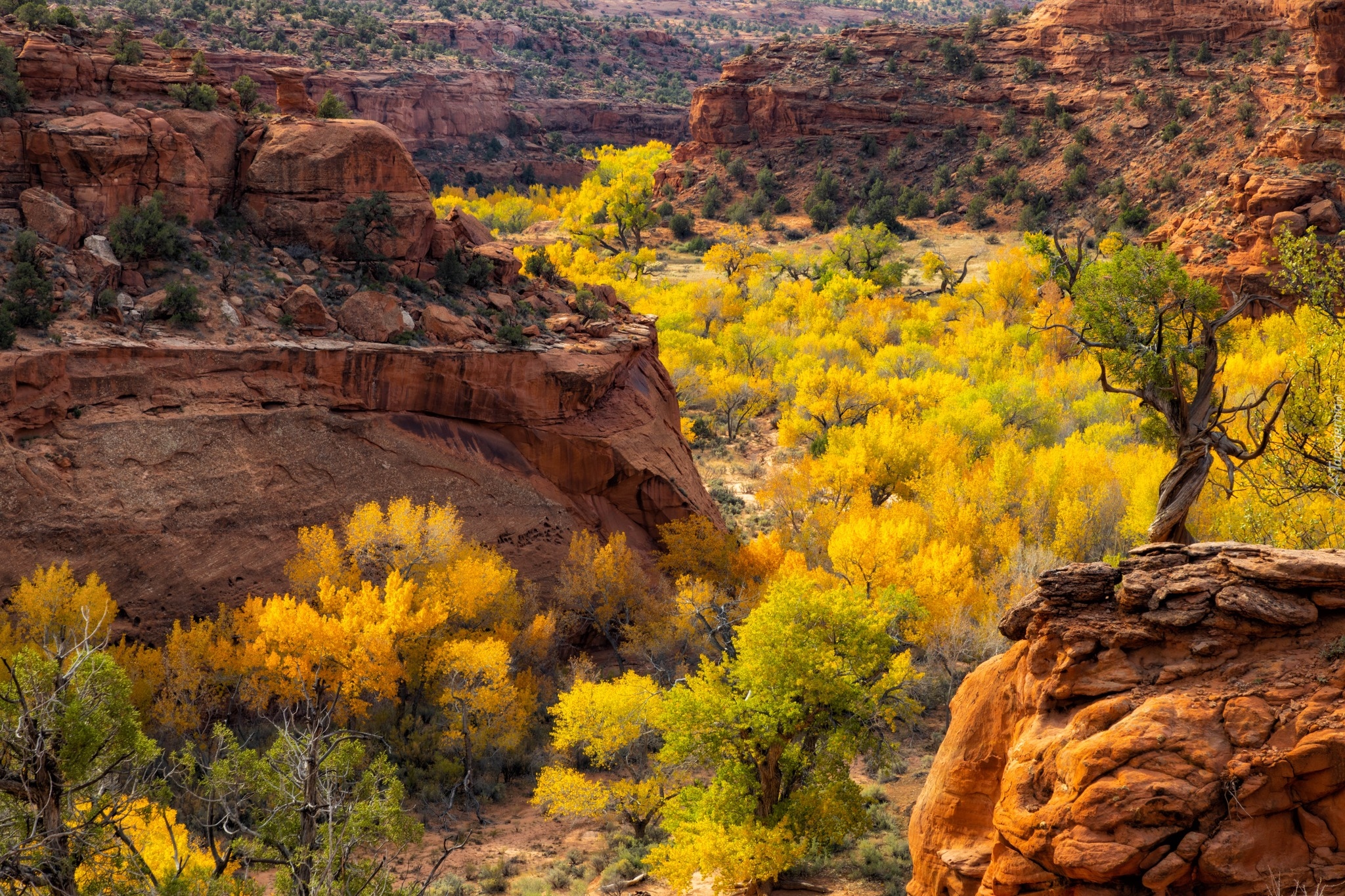 Edytor tapety: Rozświetlone pożółkłe drzewa i skały