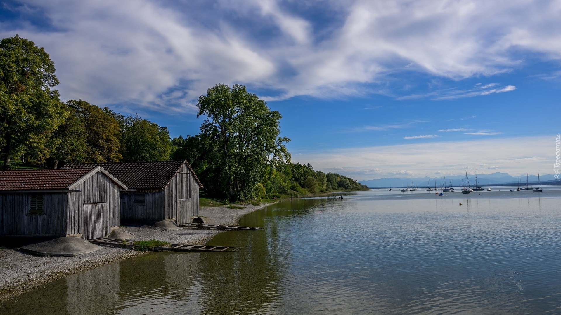 Edytor tapety: Hangary na łodzie przy brzegu jeziora