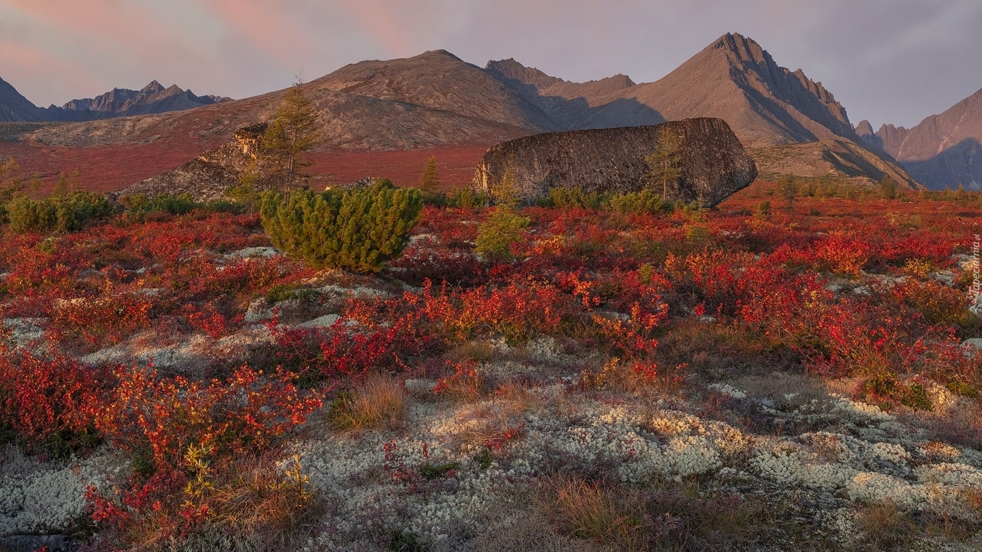Edytor tapety: Rozświetlone czerwone rośliny i iglaki na tle gór