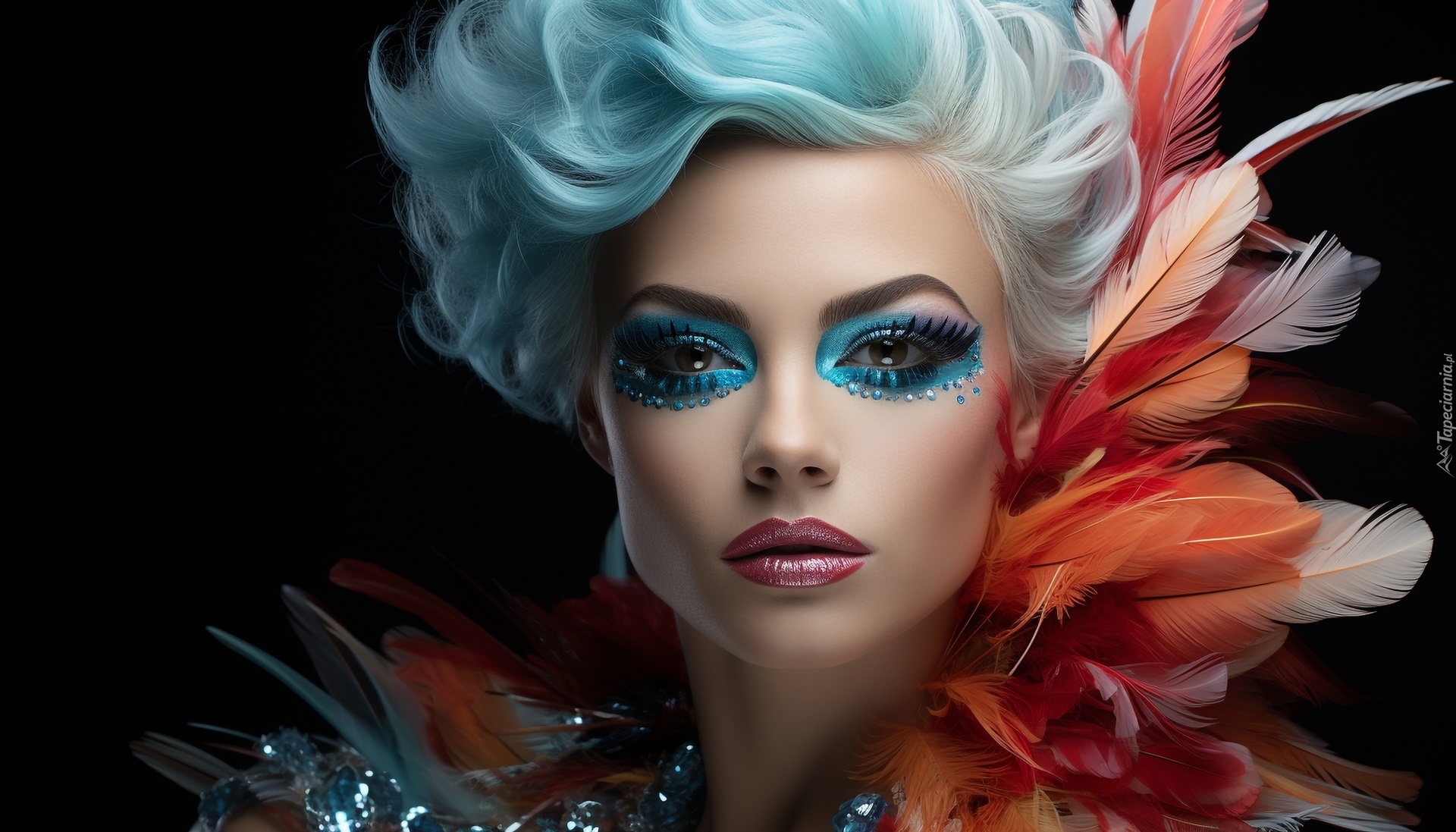 Edytor tapety: Kobieta w makijażu z kolorowymi piórami w grafice