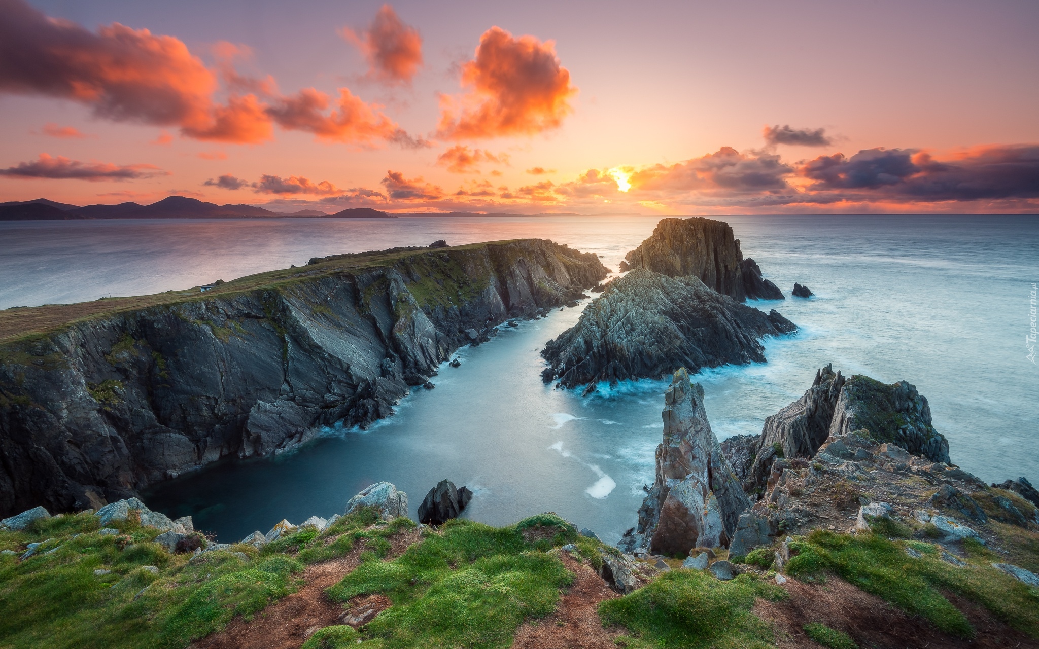 Edytor tapety: Skały na brzegu morza o zachodzie słońca