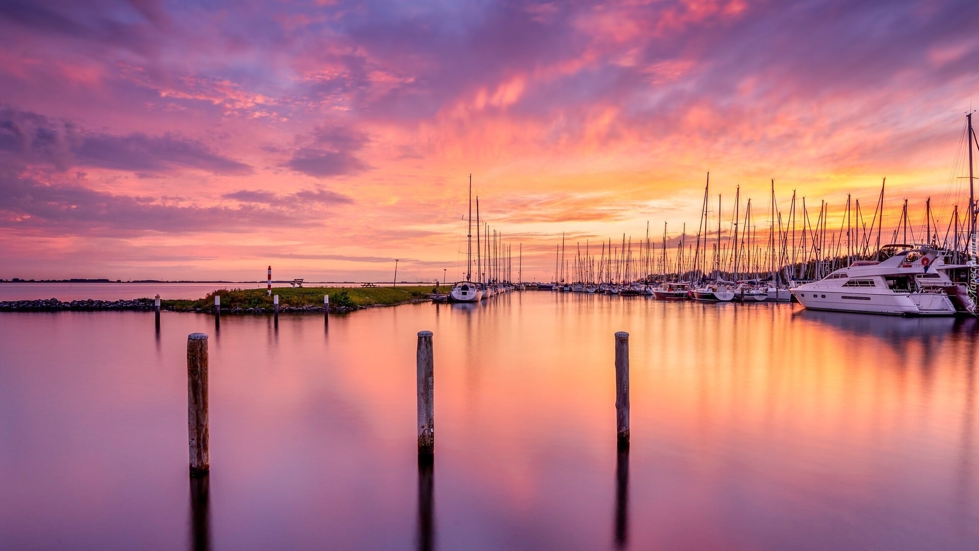 Edytor tapety: Żaglówki i jachty na przystani pod kolorowym niebem