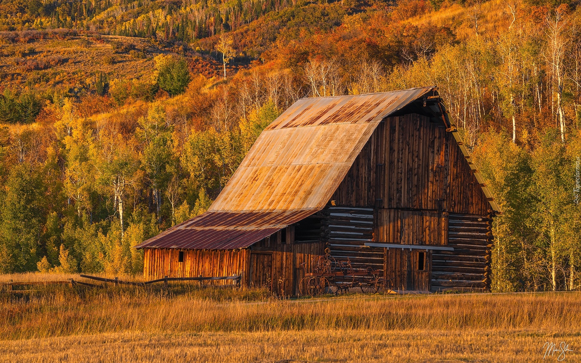 Edytor tapety: Drewniana szopa na tle pożółkłych drzew