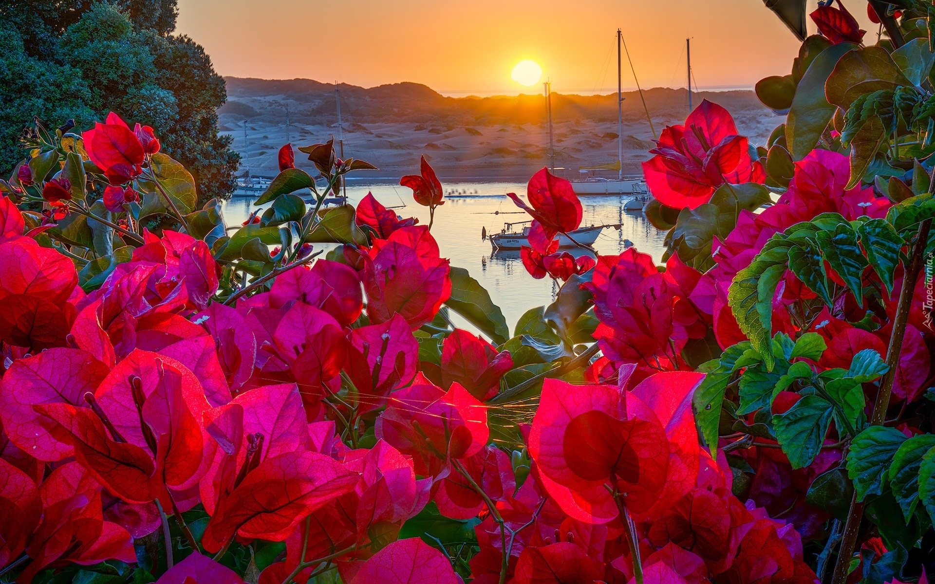 Edytor tapety: Czerwone bugenwille na tle jeziora i gór