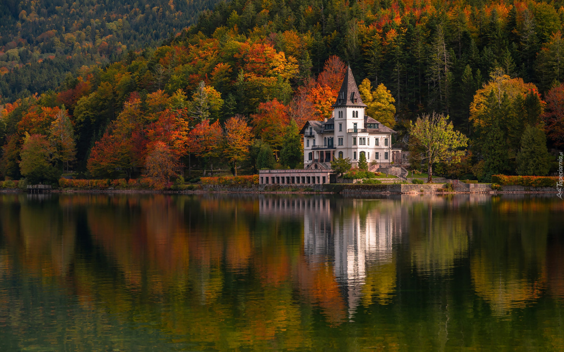 Edytor tapety: Biały dom na tle lasu nad jeziorem