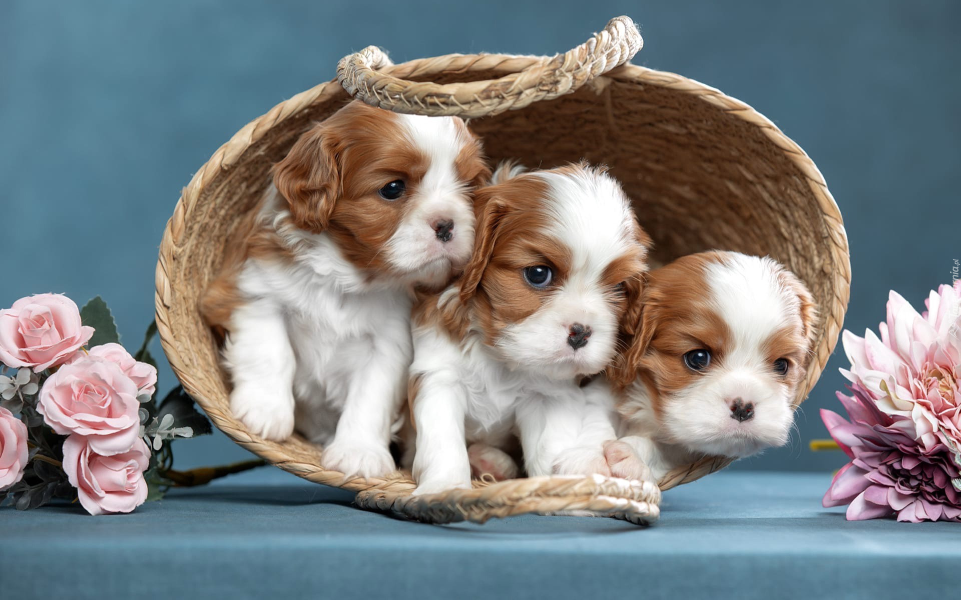 Edytor tapety: Szczeniaki cavalier king charles spaniel w koszyku
