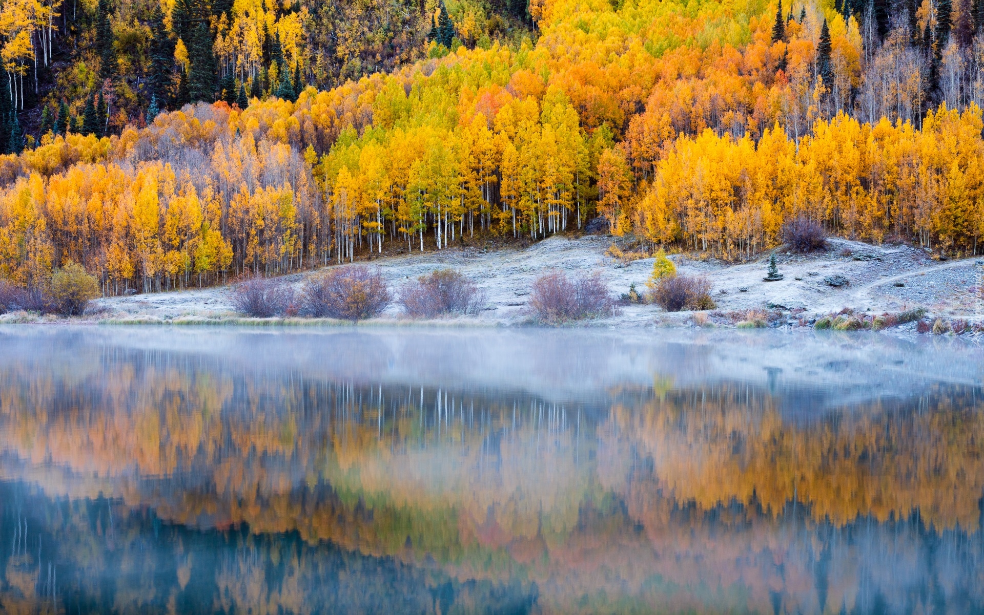 Edytor tapety: Odbicie pożółkłego lasu w jeziorze