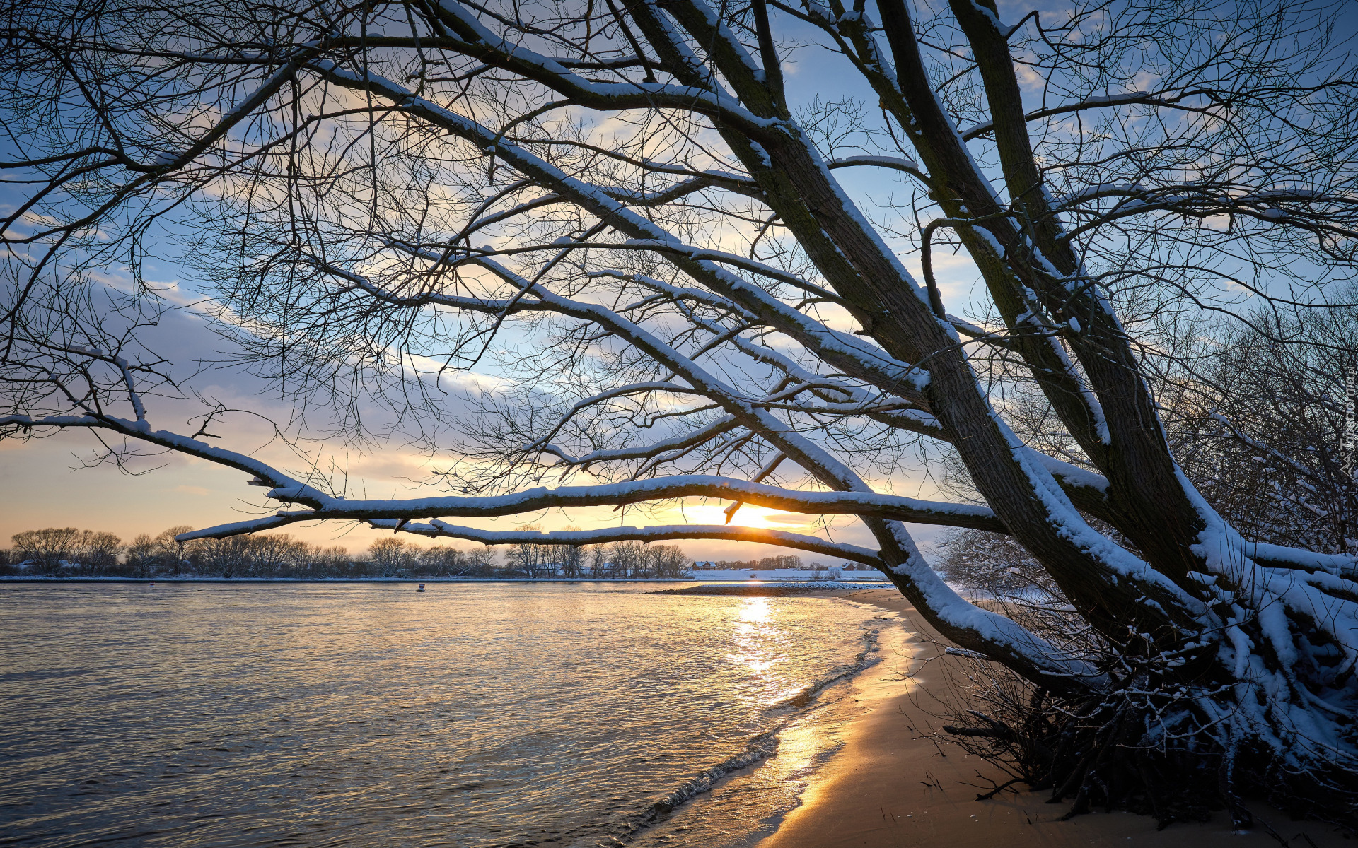 Edytor tapety: Ośnieżone gałęzie drzewa nad stawem