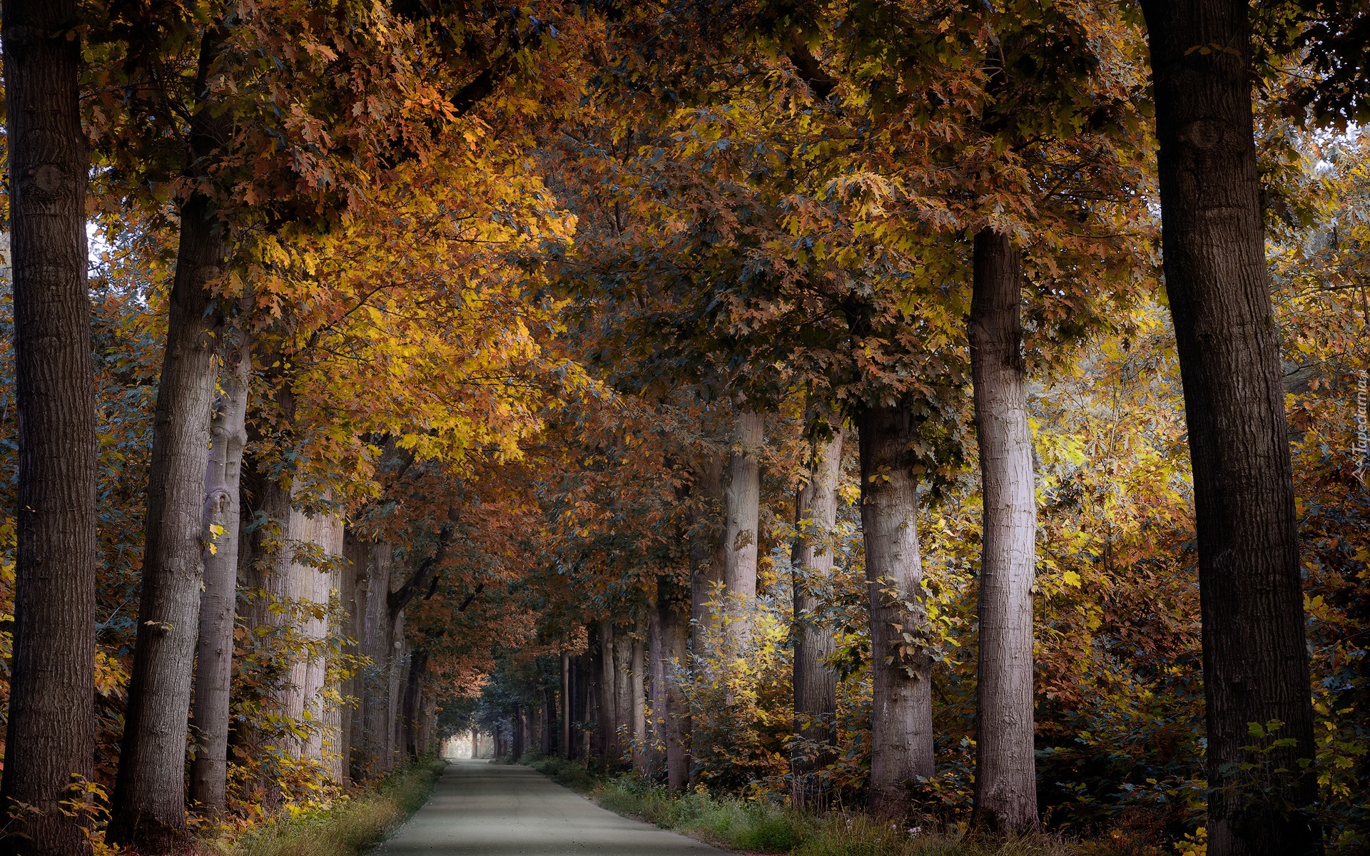 Edytor tapety: Jesienne drzewa po obu stronach drogi przez las