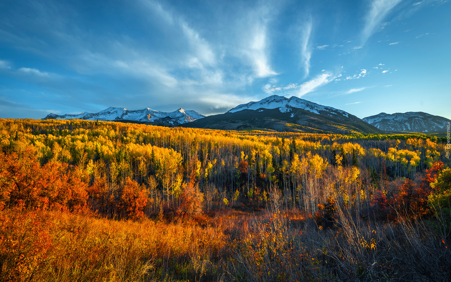 Edytor tapety: Rozświetlony jesienny las u podnóża ośnieżonych gór