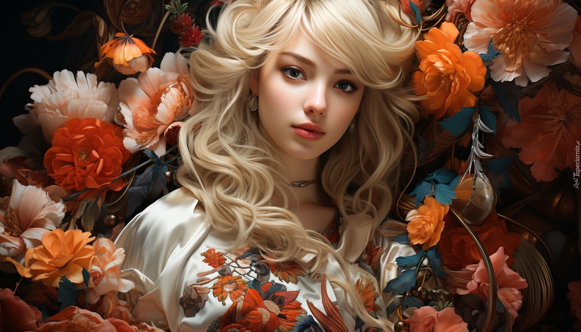 Edytor tapety: Blondynka wśród kwiatów w grafice