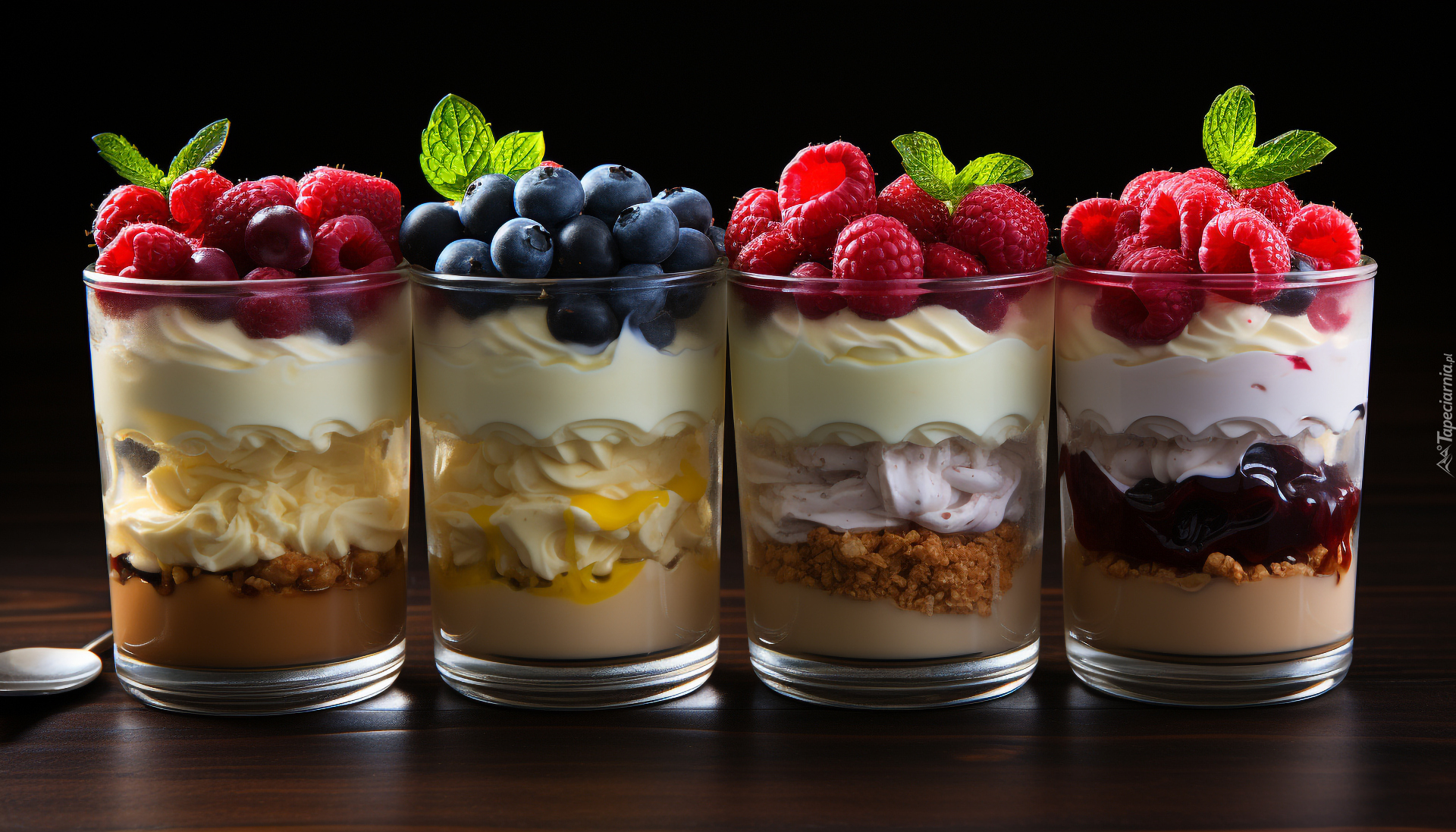 Edytor tapety: Owocowe desery w szklankach na czarnym tle