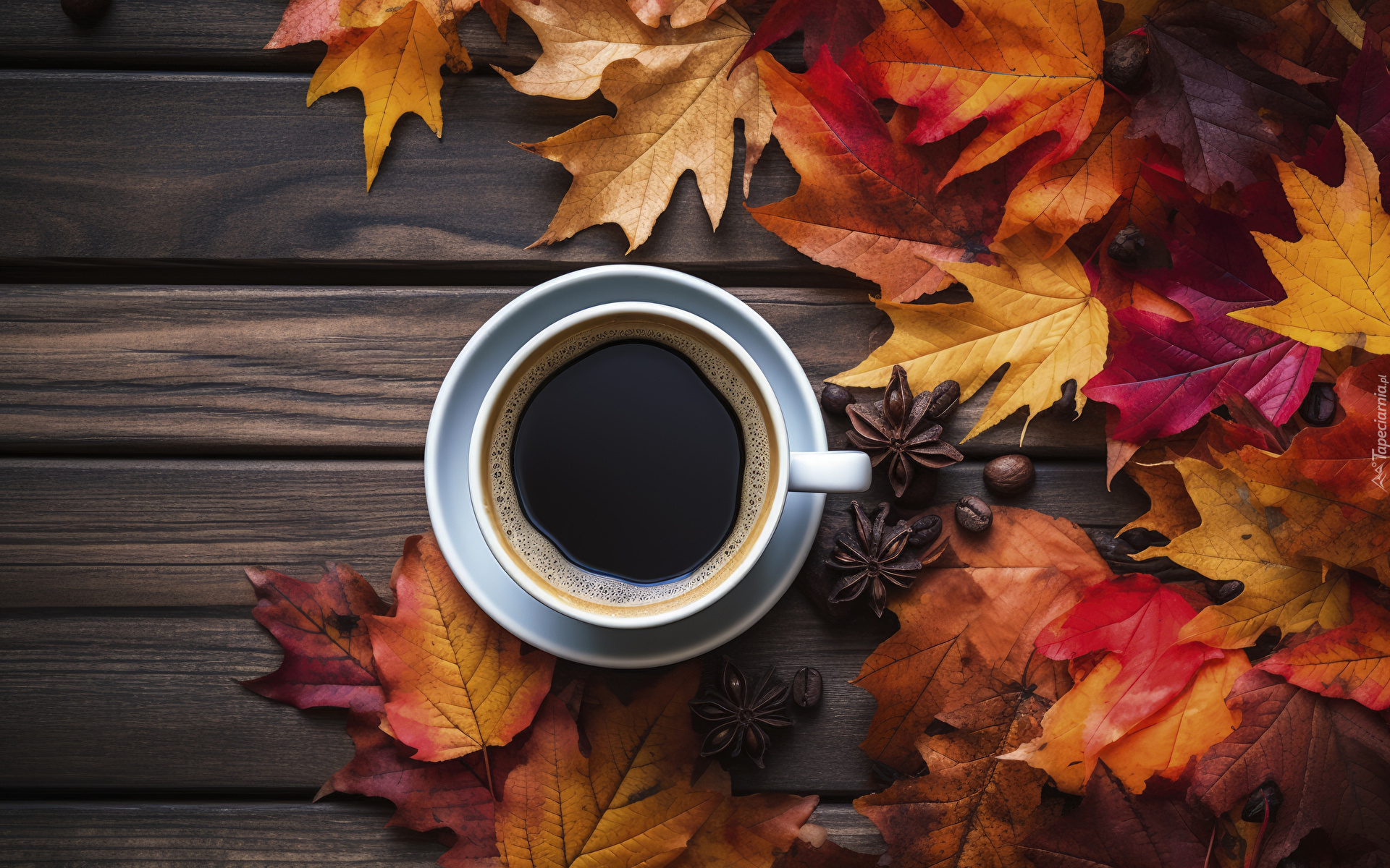 Edytor tapety: Filiżanka z kawą obok kolorowych liści
