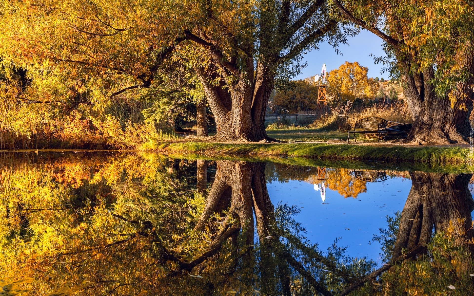 Edytor tapety: Drzewa nad stawem na farmie Rock Ledge Ranch