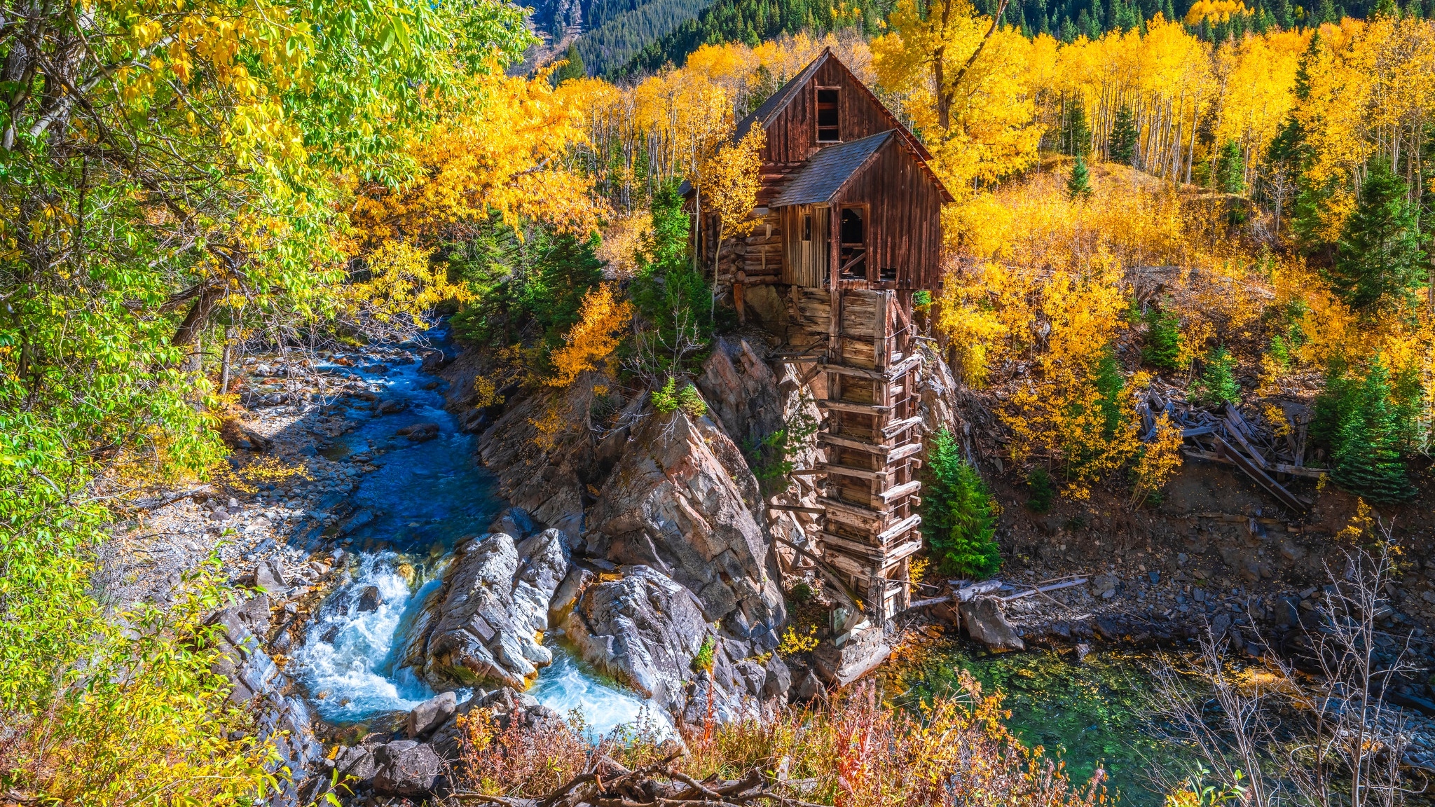 Edytor tapety: Młyn wodny Crystal Mill otoczony pożółkłymi drzewami
