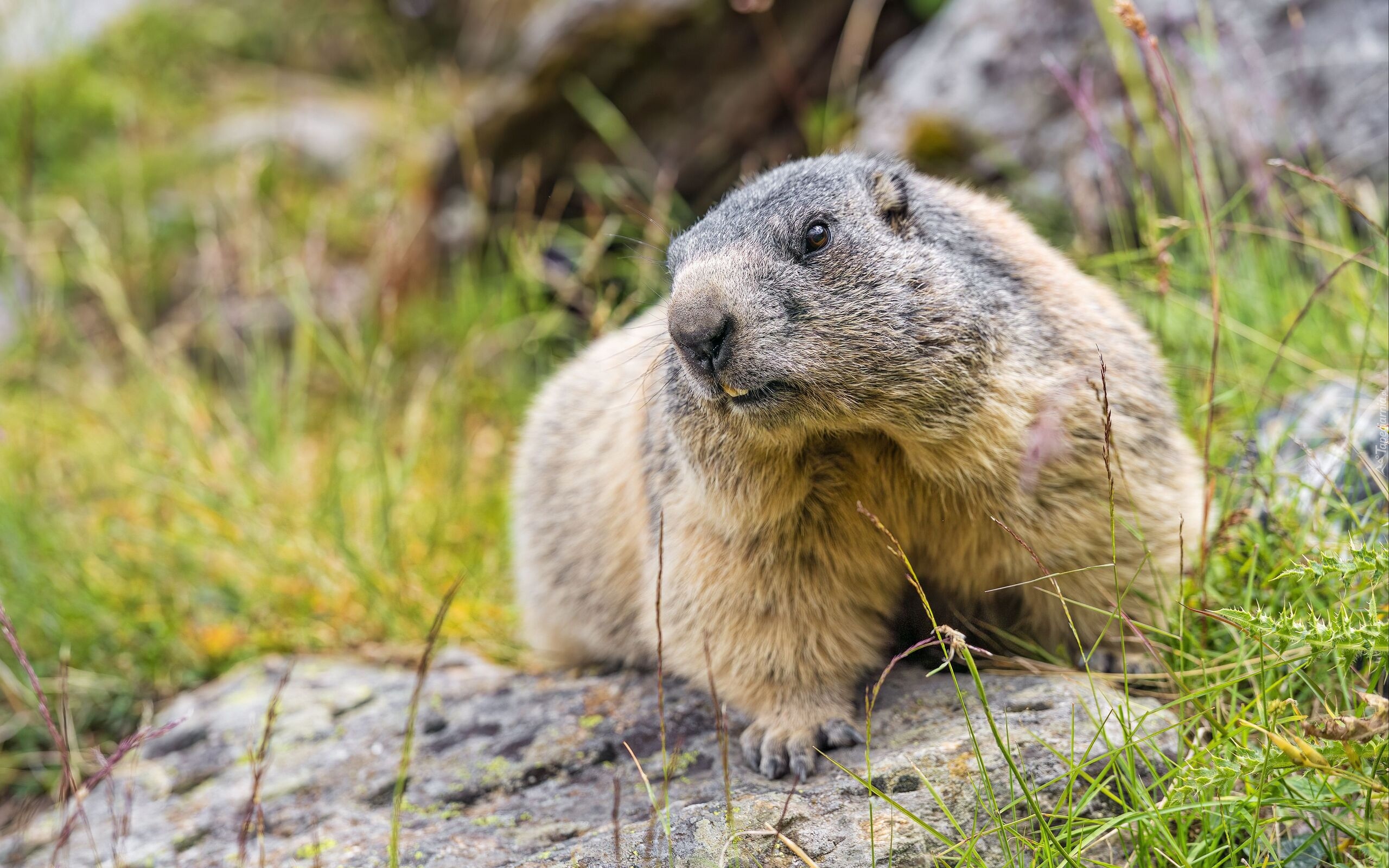 Edytor tapety: Świstak na kamieniu w trawie