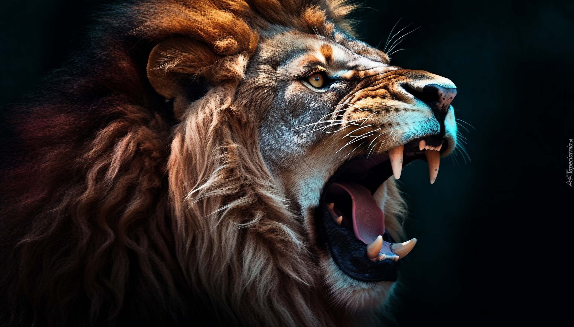 Edytor tapety: Lew z otwartą paszczą na czarnym tle