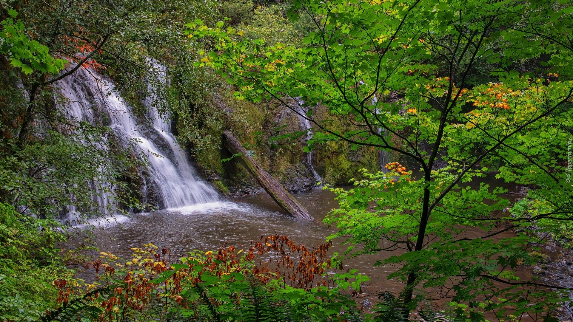 Edytor tapety: Drzewa na skałach przy wodospadzie Beaver Creek Fall