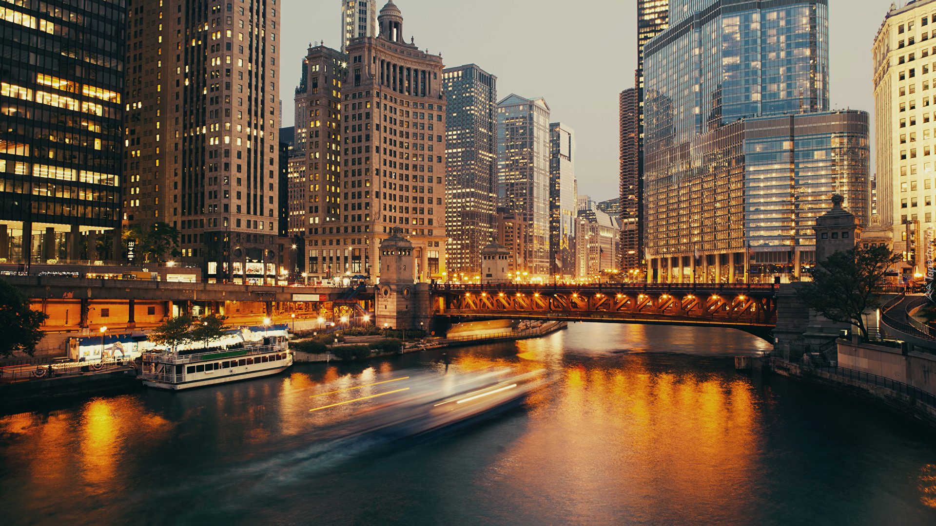 Edytor tapety: Most i oświetlone domy nad rzeką w Chicago