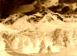 Edytor tapety: Droga wśród jesiennych drzew na tle ośnieżonych gór