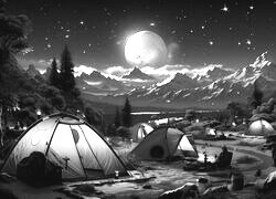 Edytor tapety: Rozświetlone nocą namioty w górach zimową porą w grafice