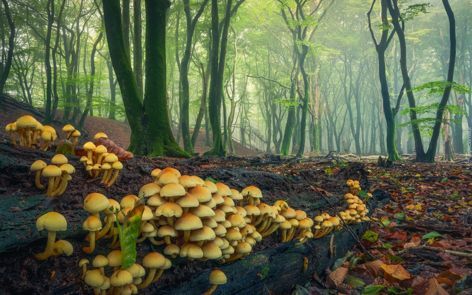 Edytor tapety: Grzyby na spróchniałym pniu drzewa w lesie