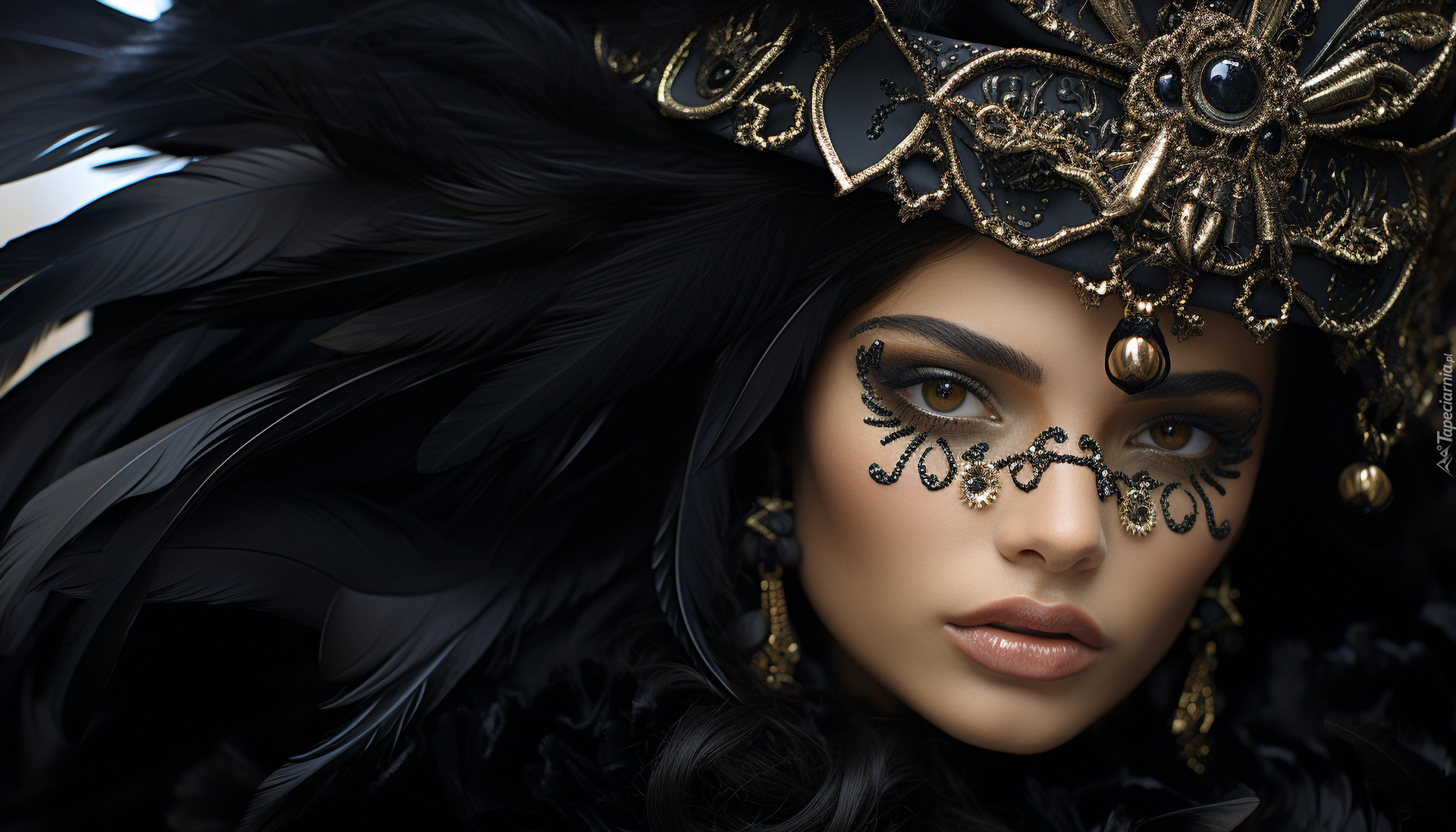 Edytor tapety: Kobieta z biżuterią i czarnymi piórami we włosach