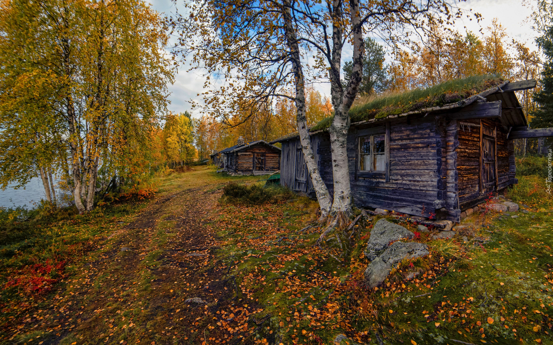 Edytor tapety: Drewniane domki pod jesiennymi brzozami nad jeziorem