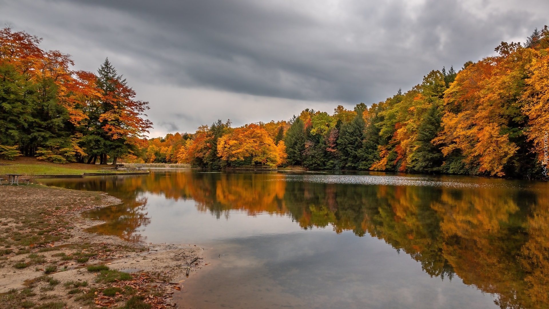 Edytor tapety: Zachmurzone niebo nad lasem i jeziorem