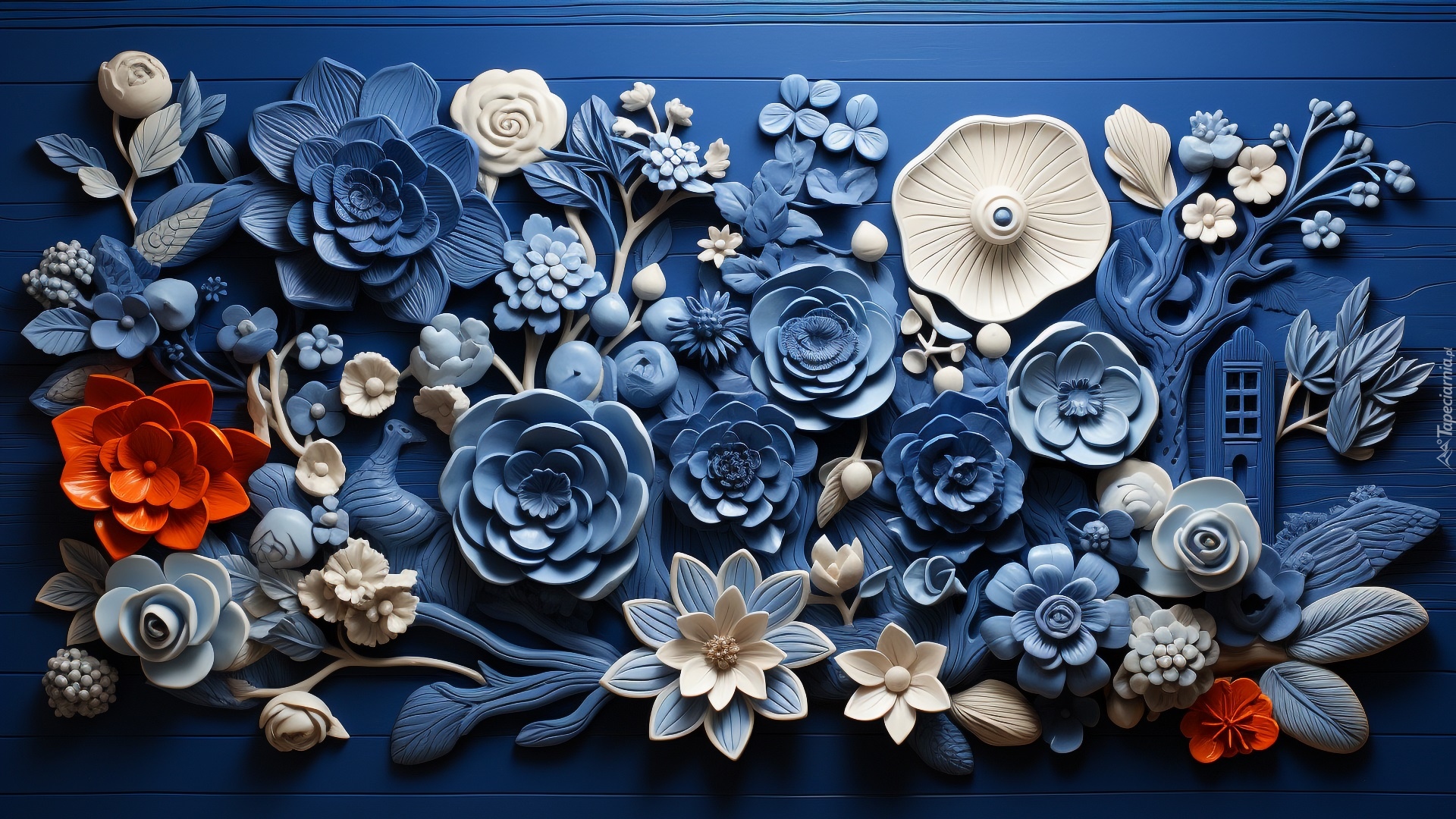 Edytor tapety: Kolorowe kwiaty na niebieskich deskach w grafice