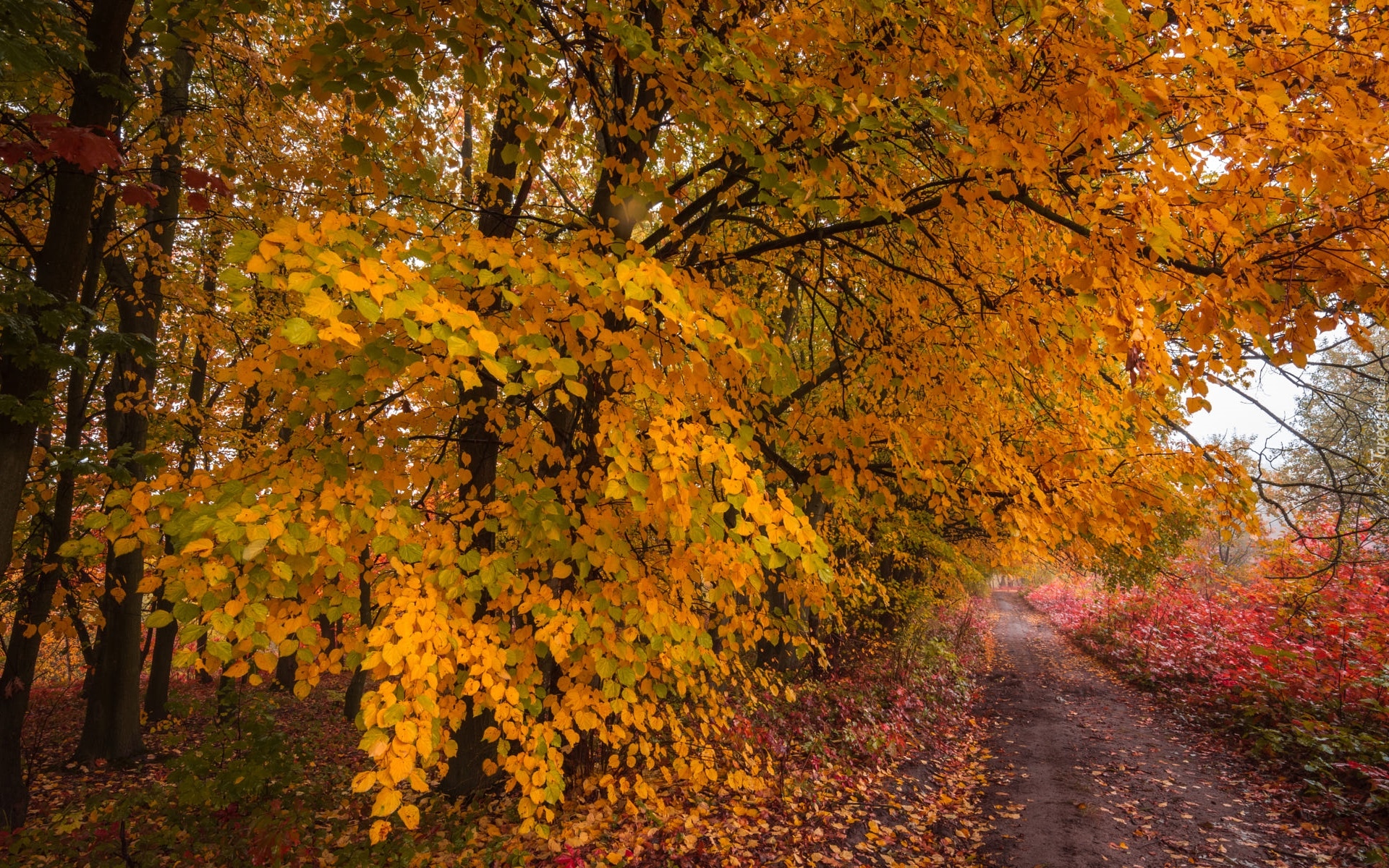 Edytor tapety: Kolorowe jesienne drzewa i krzewy przy leśnej ścieżce