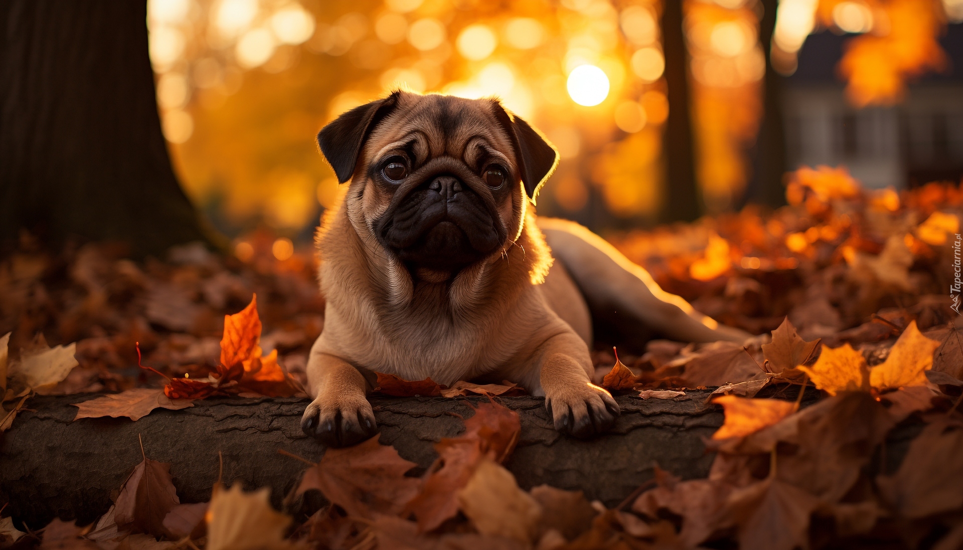 Edytor tapety: Mops leżący na jesiennych liściach w lesie