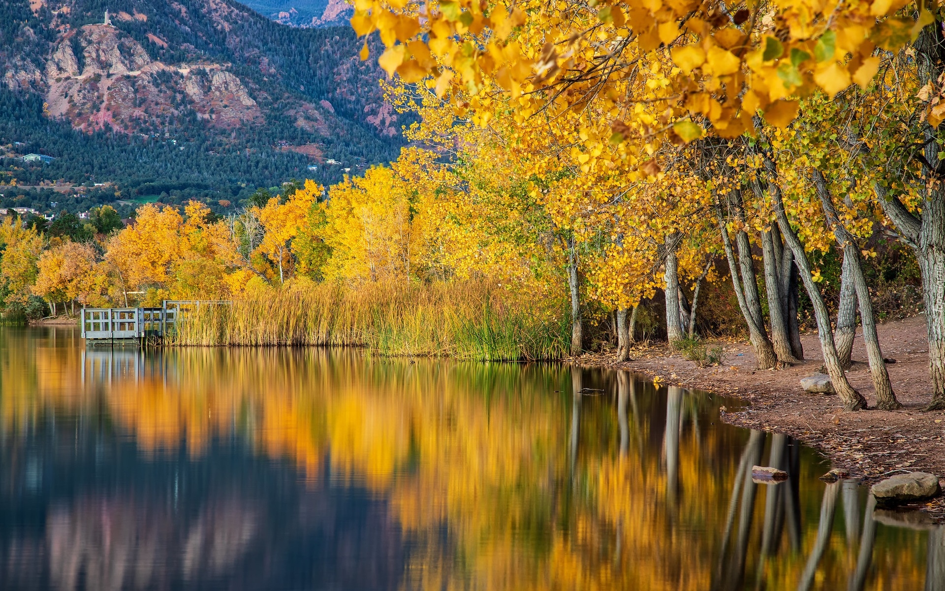 Edytor tapety: Odbicie jesiennych drzew w jeziorze górskim