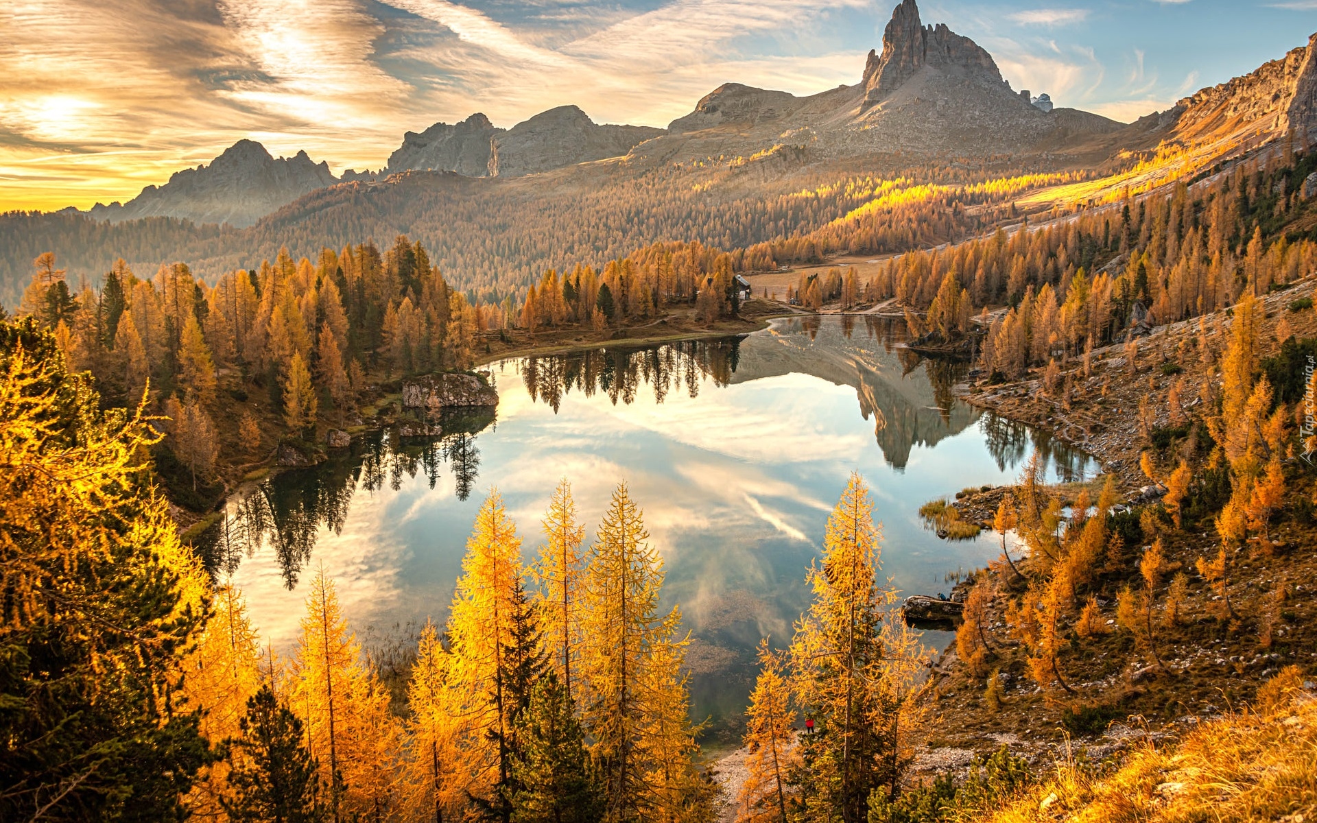 Edytor tapety: Jesienne drzewa wokół jeziora Federa we włoskich Dolomitach