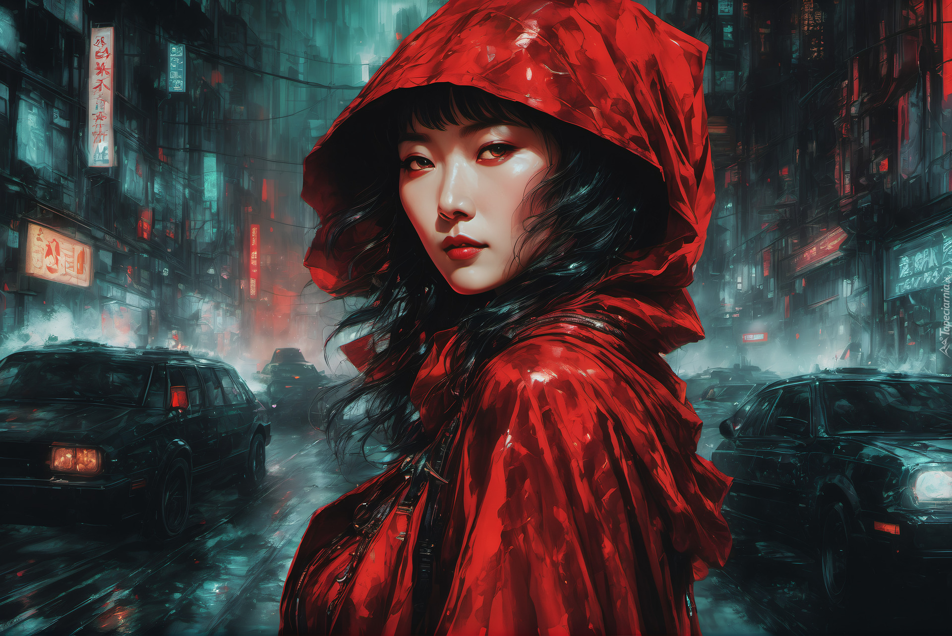 Edytor tapety: Azjatka w czerwonej pelerynie z kapturem