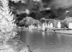 Edytor tapety: Skaliste góry nad jeziorem pod chmurami