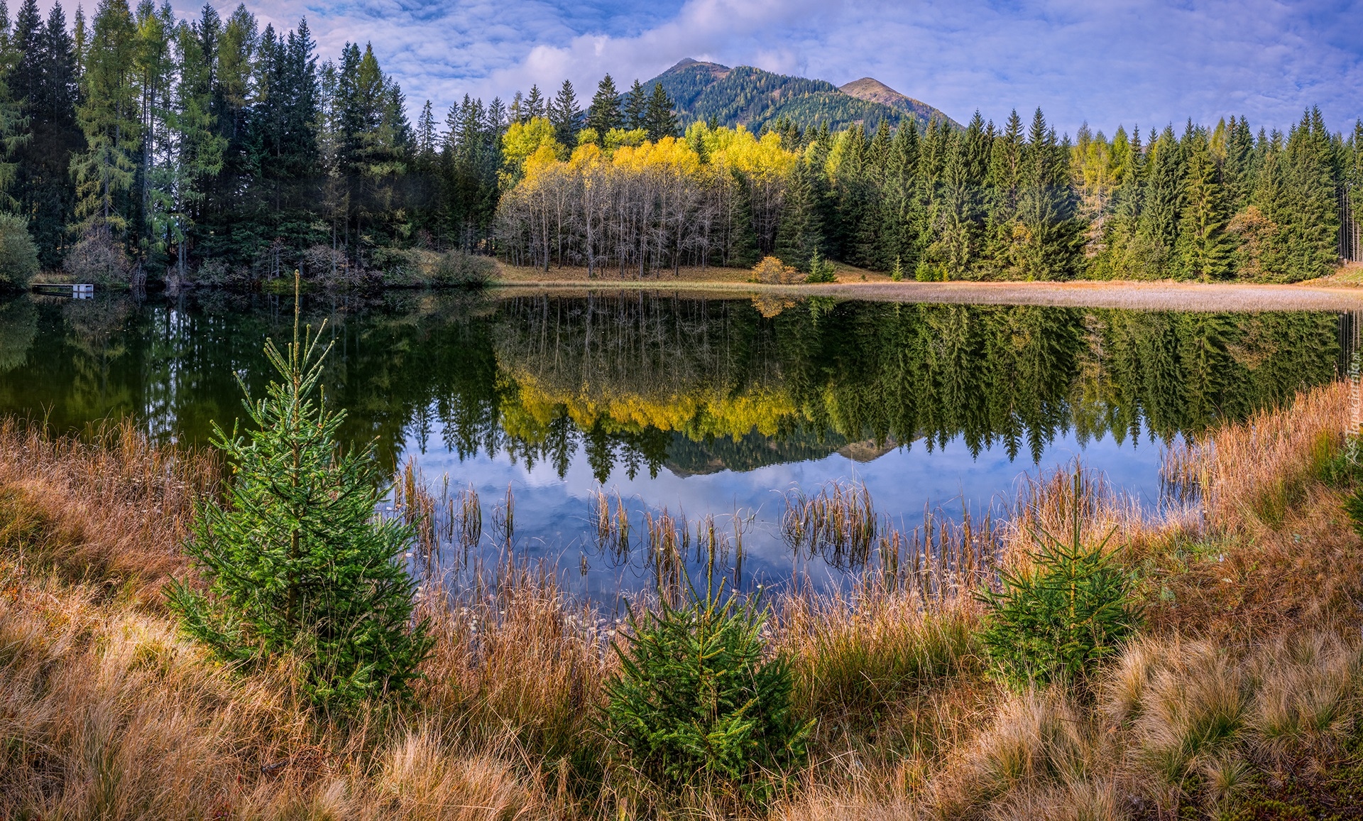 Edytor tapety: Odbicie nieba gór i jesiennych drzew w jeziorze