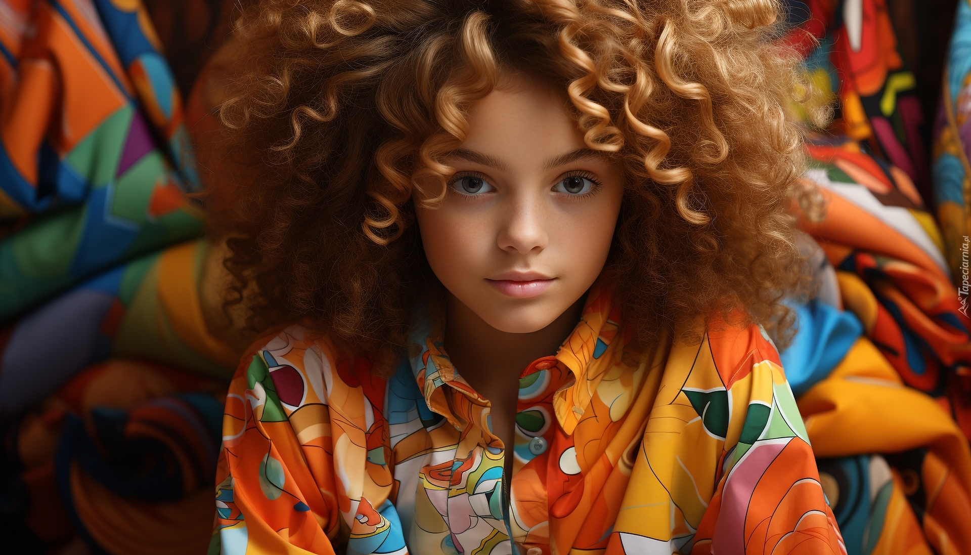 Edytor tapety: Dziewczynka z kręconymi włosami w kolorowej koszuli