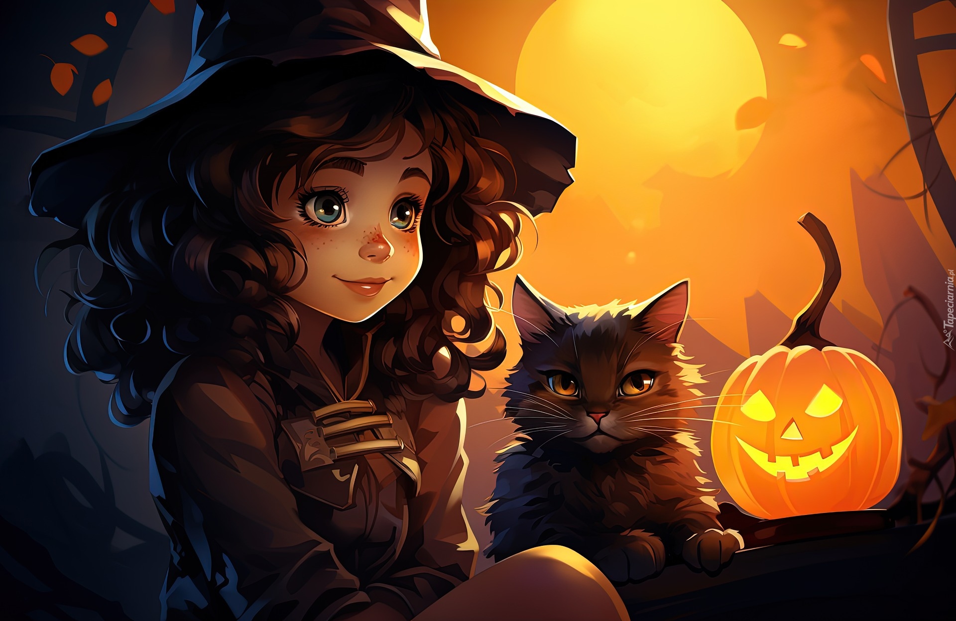 Edytor tapety: Dziewczynka w kapeluszu z kotem obok podświetlonej dyni