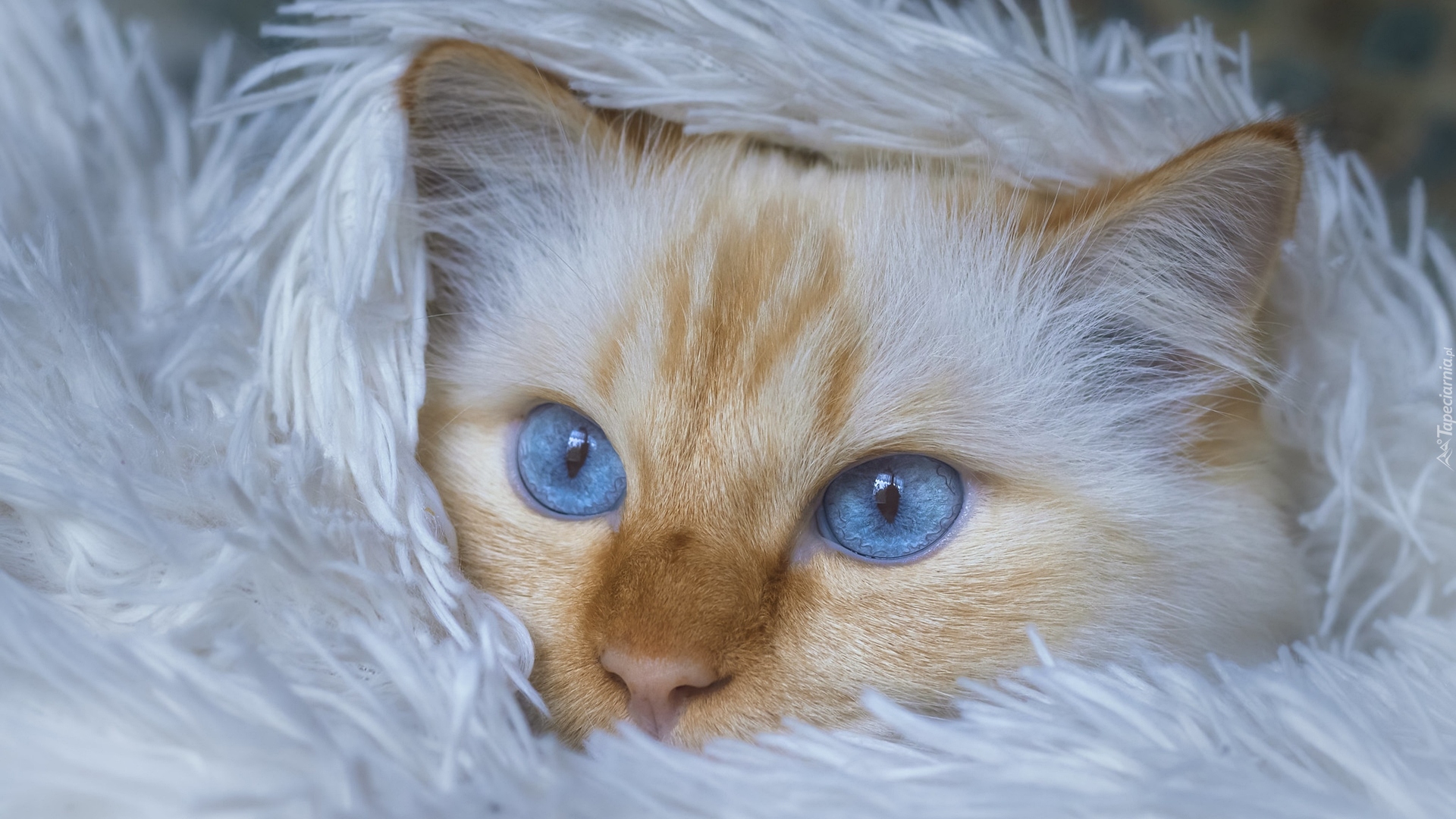 Edytor tapety: Rudawy niebieskooki kot pod białym kocem