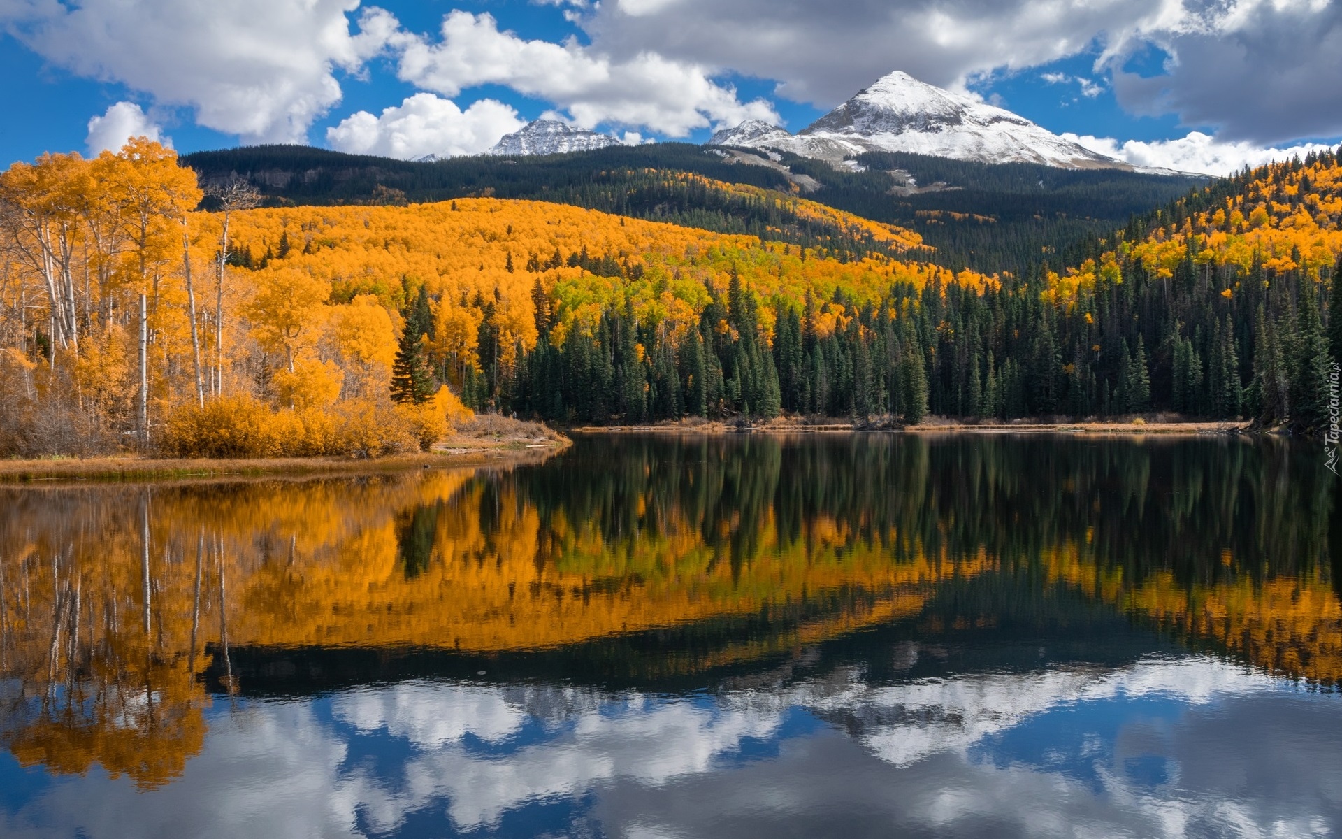 Edytor tapety: Kolorowy las u podnóża gór nad jeziorem