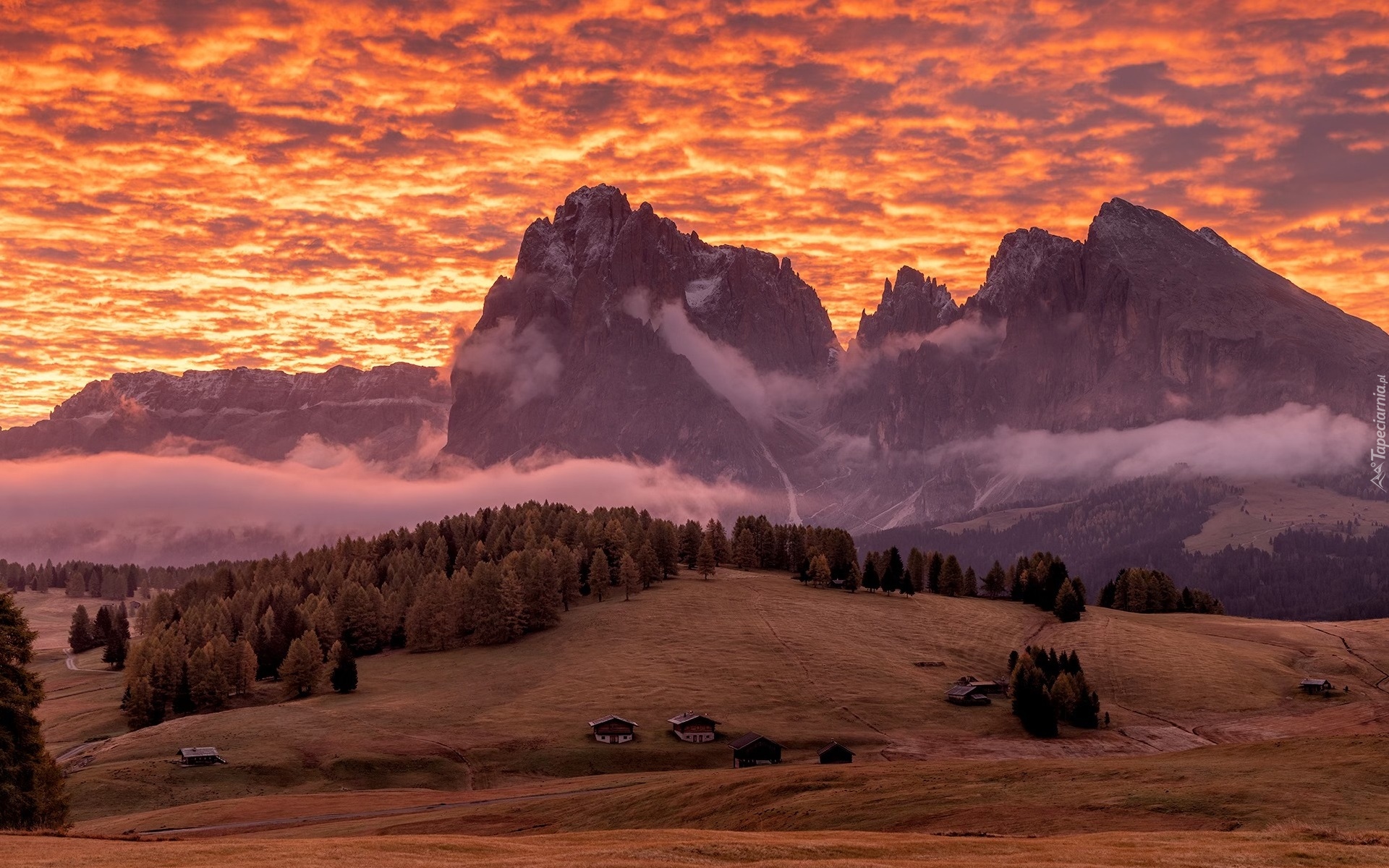 Edytor tapety: Góry Sassolungo pod malowniczym niebem zachodzącego słońca